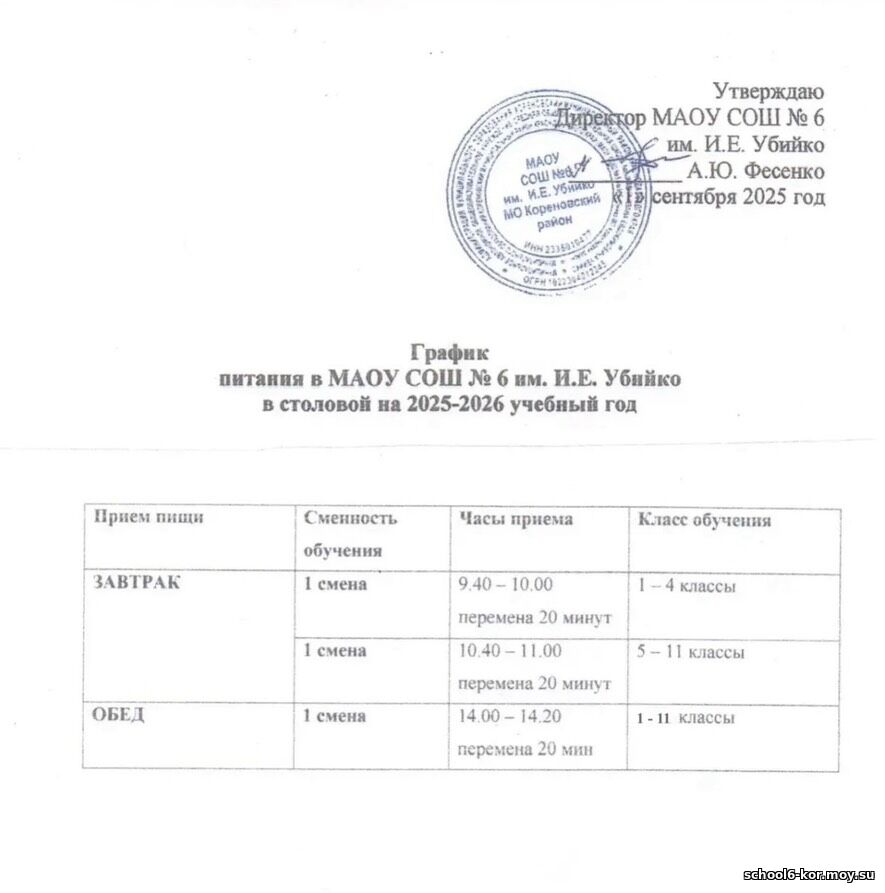 График питания учащихся МАОУ СОШ №6 им И.Е. Убийко МО Кореновский район