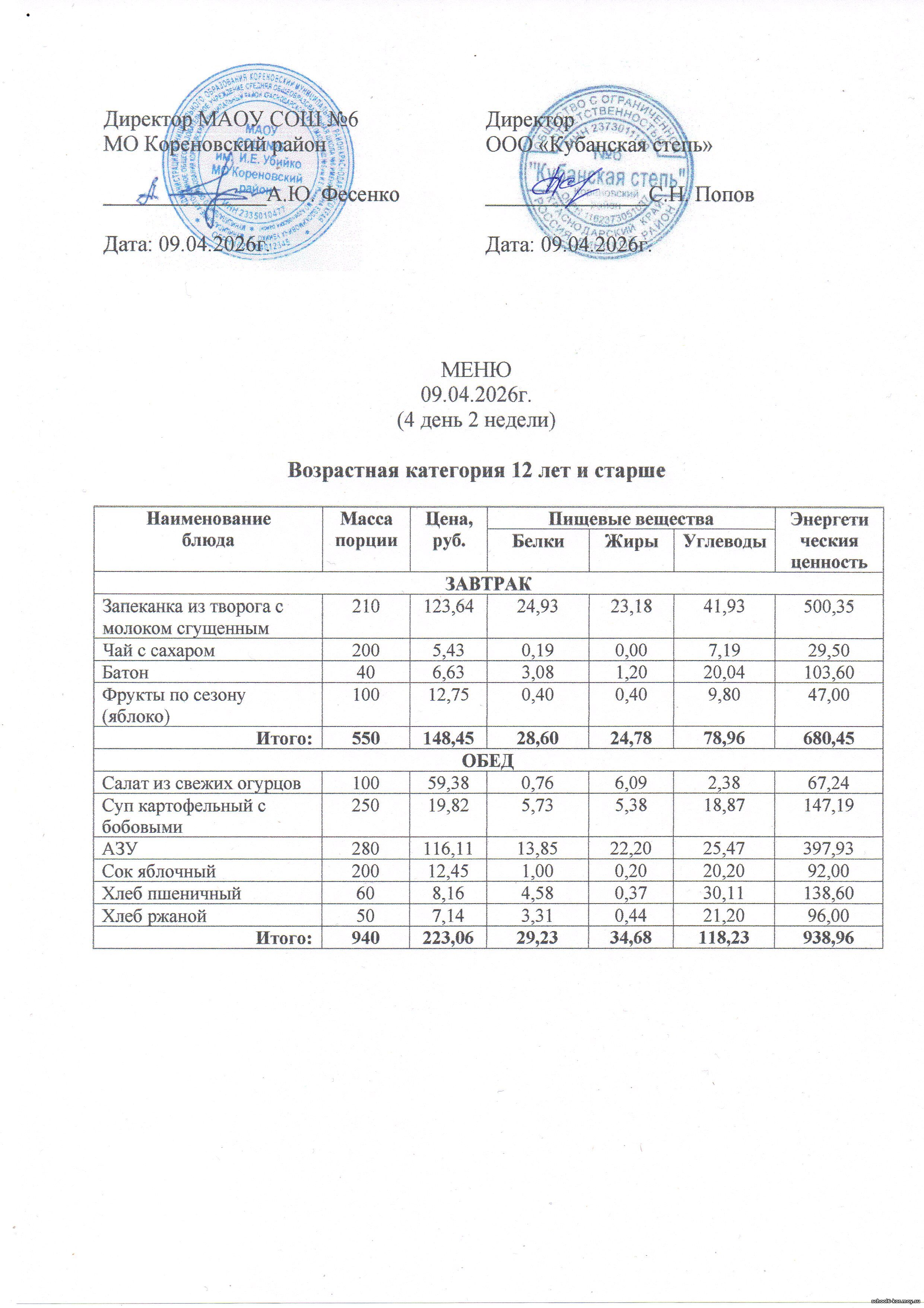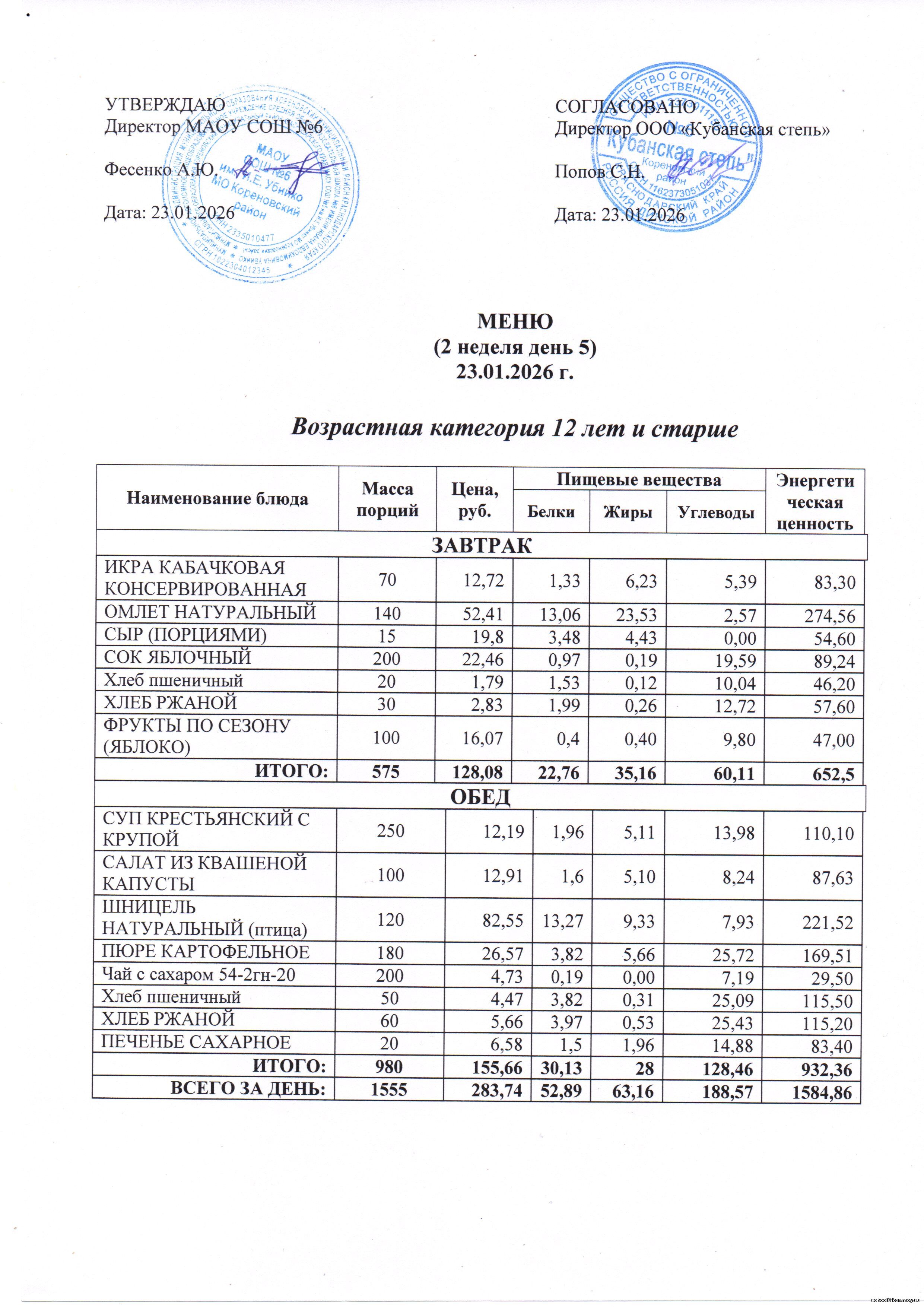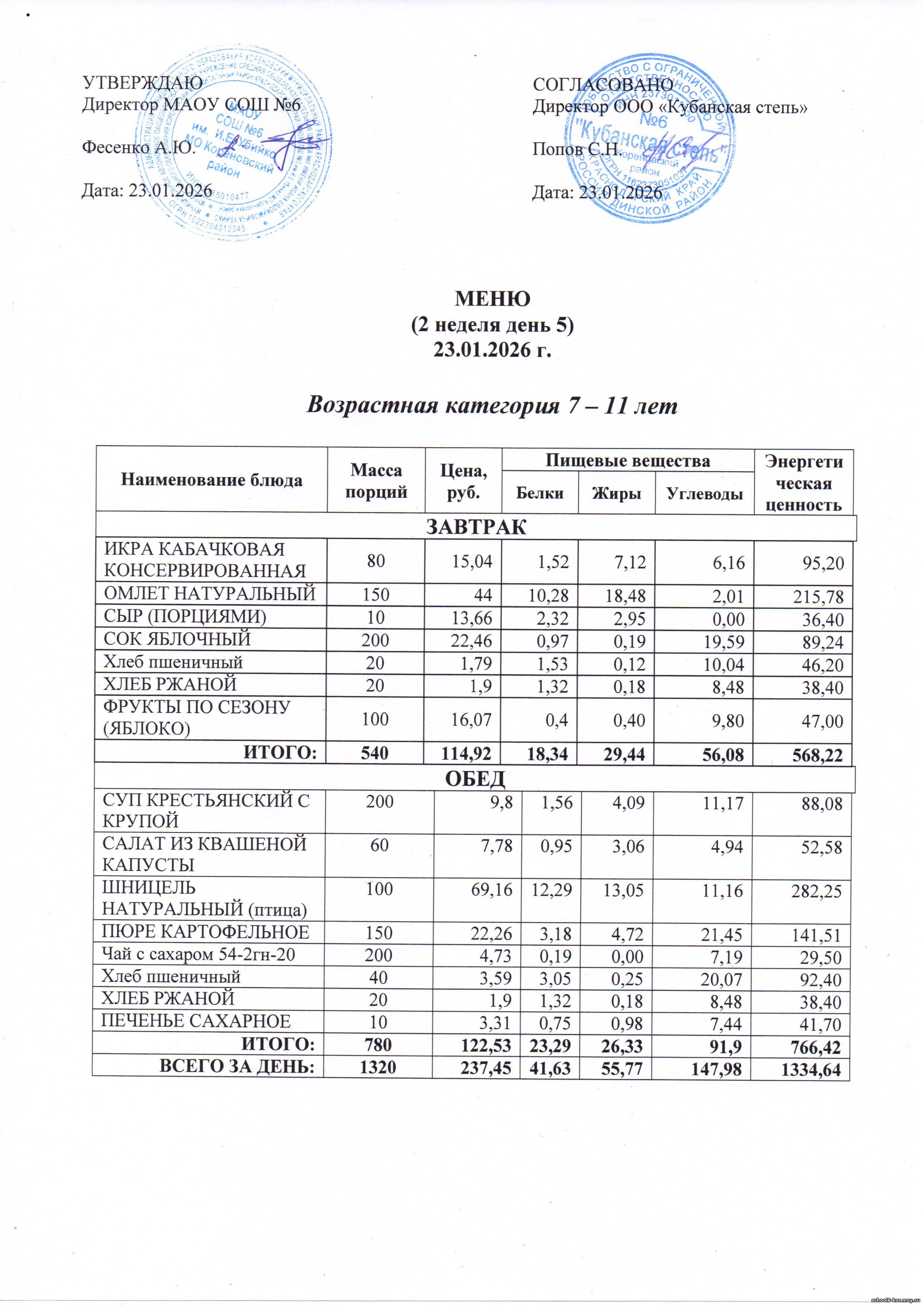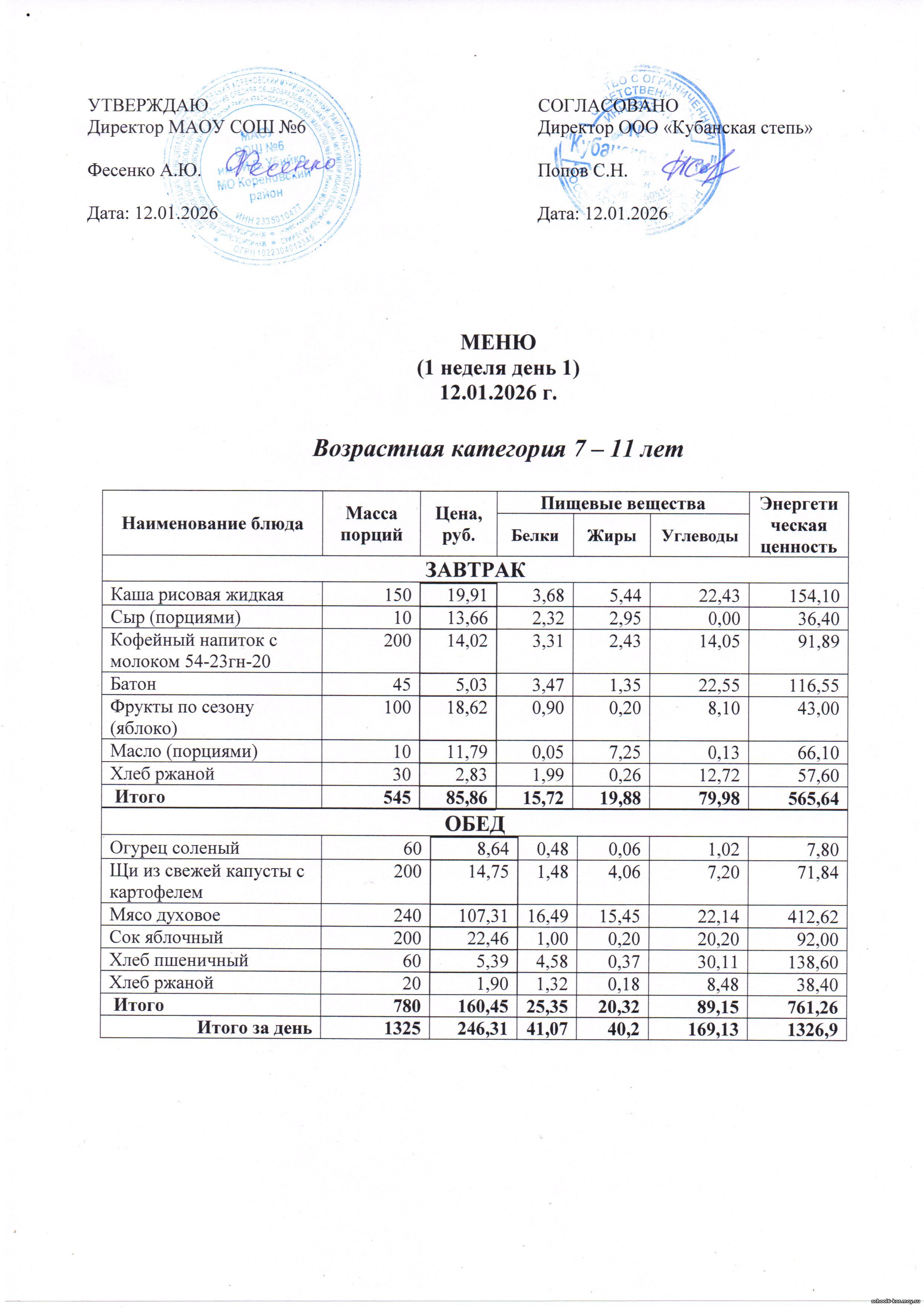В школе действует двухнедельное меню, которое утверждается Начальником территориального отдела управления Роспотребнадзора по Краснодарскому краю в Выселковском, Усть-Лабинсокм, Кореновском и Динском районах.