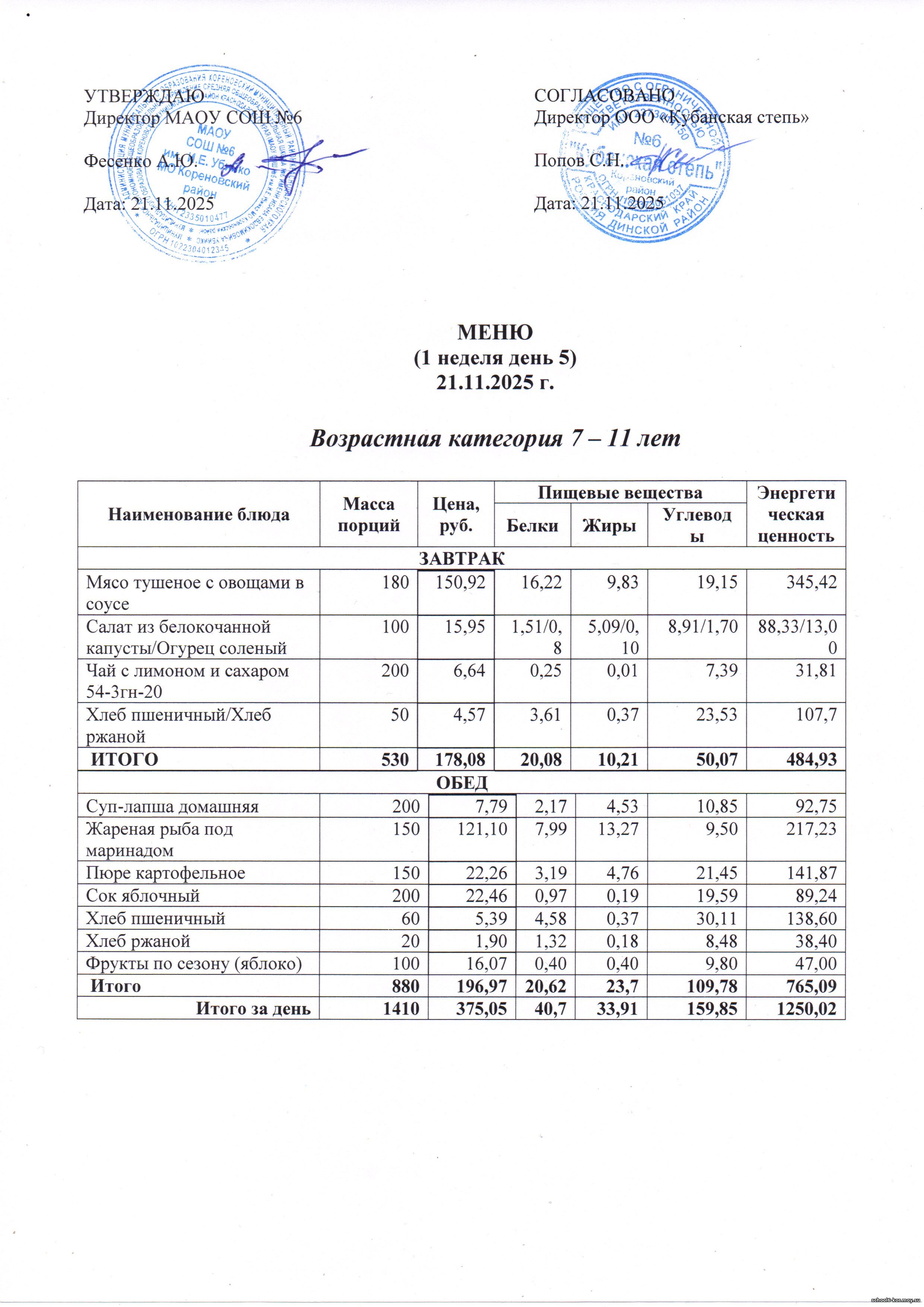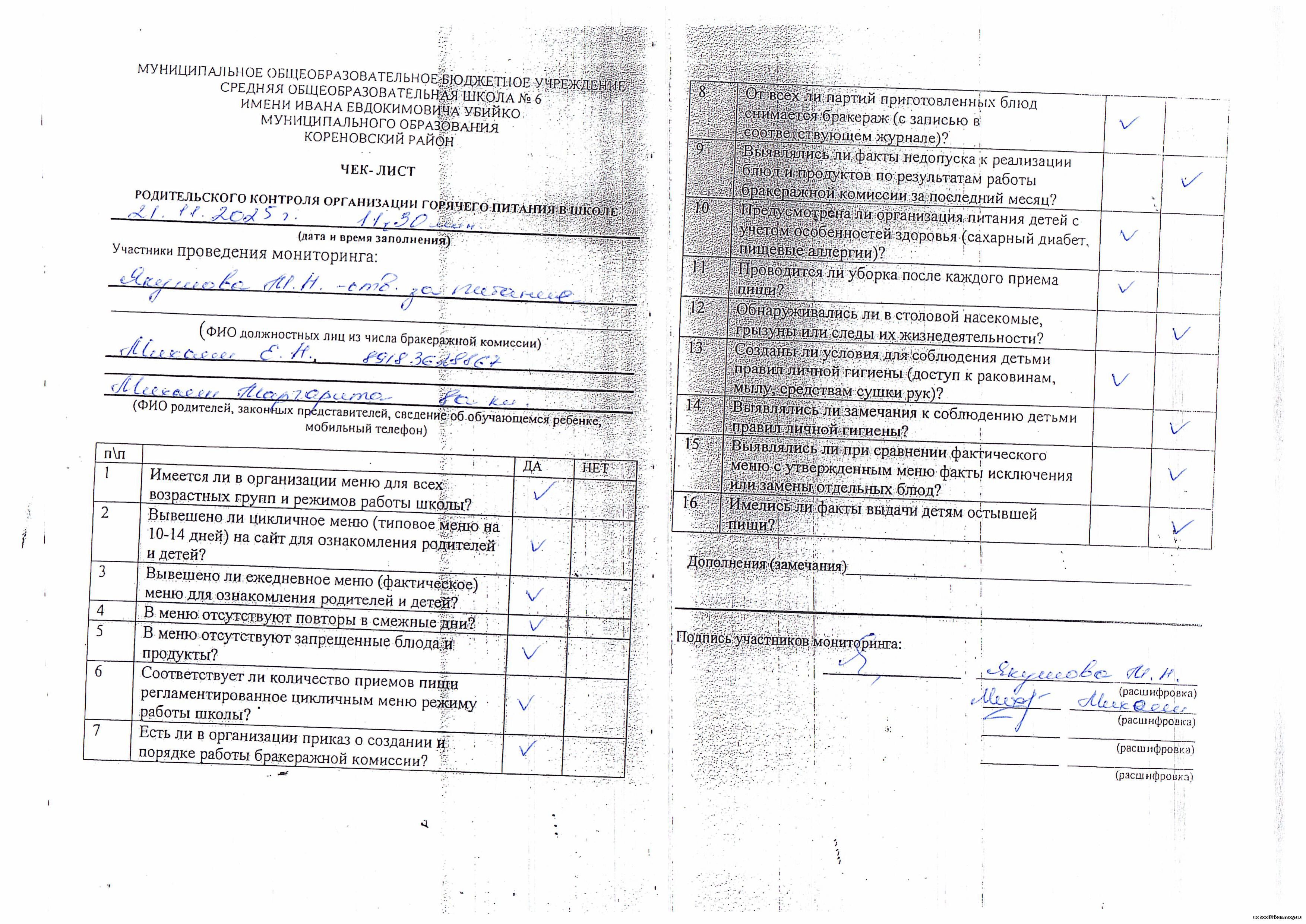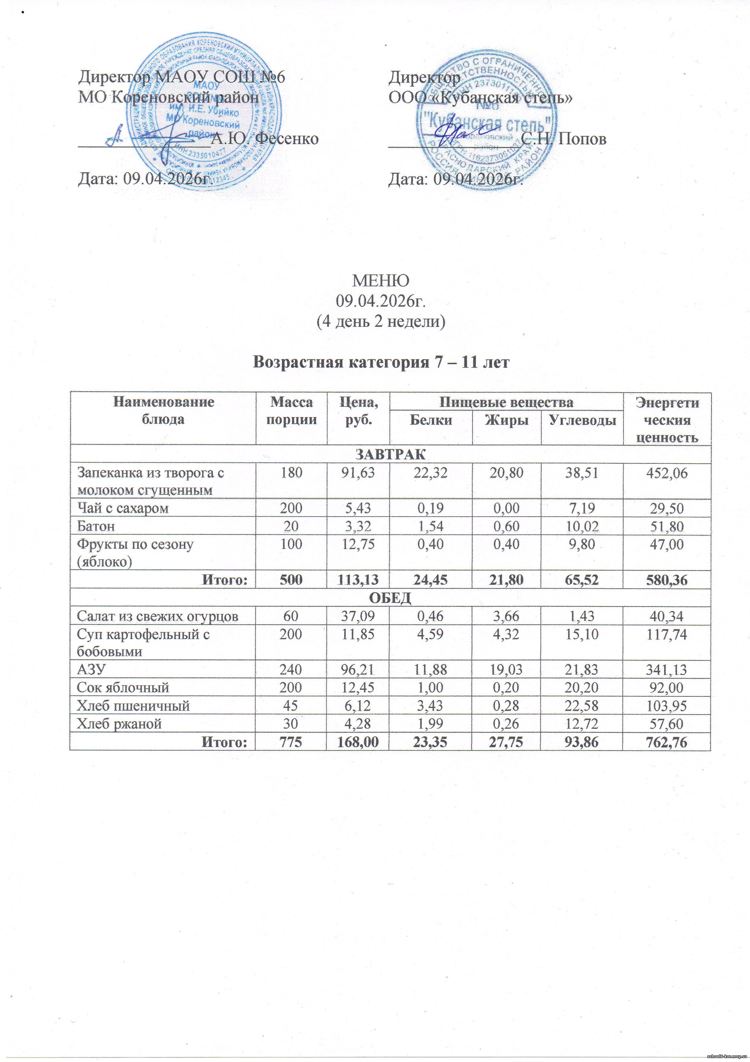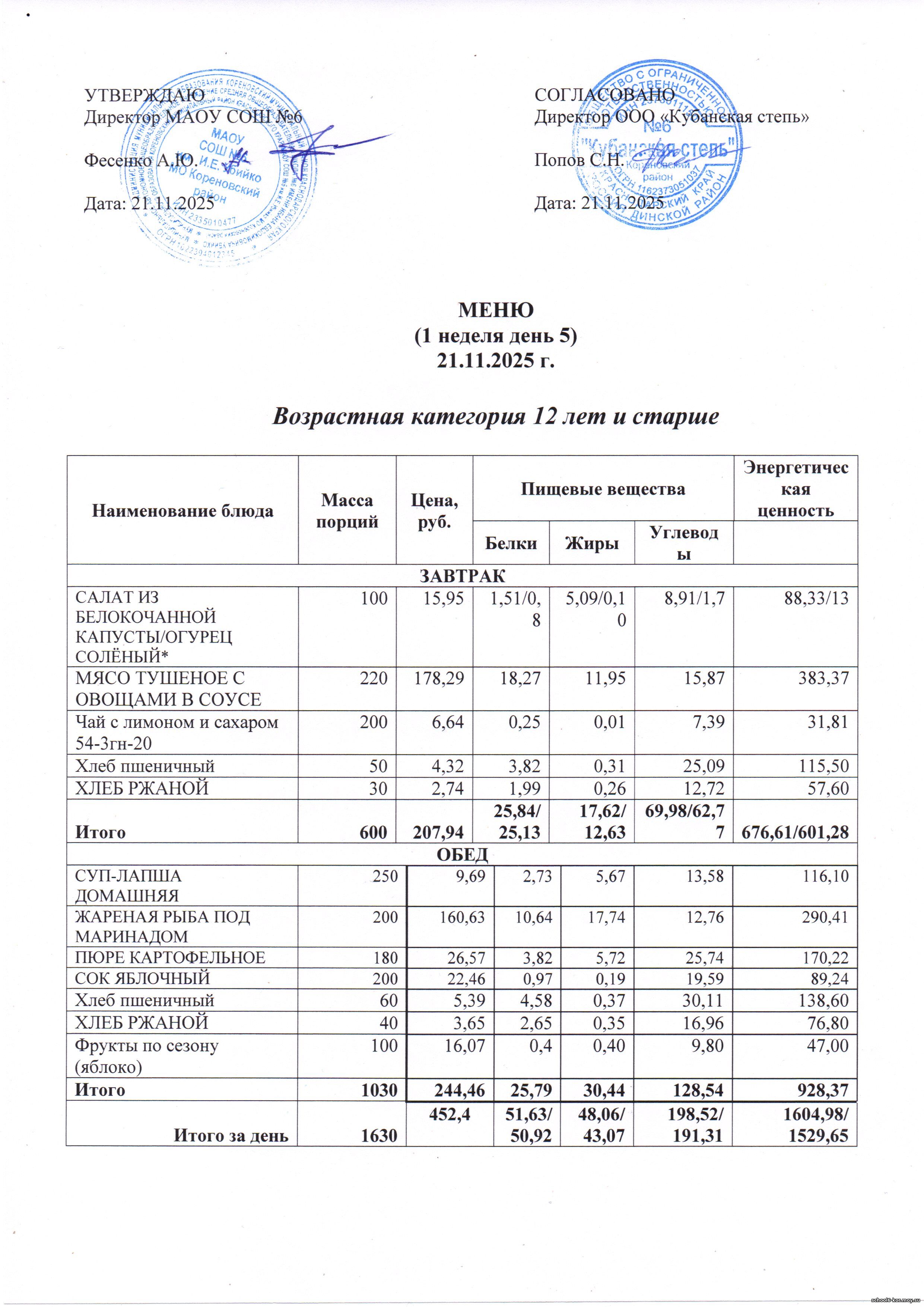 В школе действует двухнедельное меню, которое утверждается Начальником территориального отдела управления Роспотребнадзора по Краснодарскому краю в Выселковском, Усть-Лабинсокм, Кореновском и Динском районах.